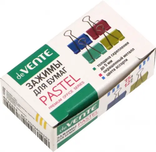 Зажим для бумаг "deVENTE. Pastel" металлический (15 мм) толщина скрепления до 5 мм, цветной ассорти, 12 шт в картонной коробке