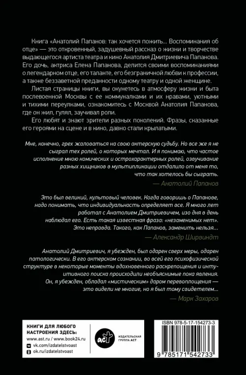 Книга «Анатолий Папанов: так хочется пожить... Воспоминания об отце» — это откровенный, задушевный рассказ о жизни и творчестве выдающегося актера театра и кино Анатолия Дмитриевича Папанова.