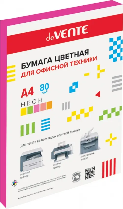 Бумага цветная для офисной техники "deVENTE" A4 100 л, 75 г/м?, неон малиновый, в пластиковом пакете