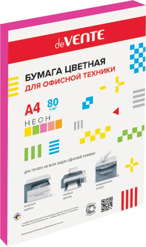 Бумага цветная для офисной техники "deVENTE" A4 50 л, 75 г/м?, неон малиновый, в пластиковом пакете