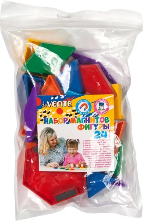 Набор магнитов "deVENTE. Магнитные фигуры" пластиковых, цвета ассорти (7 цветов радуги - красный, оранжевый, желтый, зеленый, голубой, синий, фиолетовый) 24 фигуры (шестиугольники-2 шт, трапеции - 3 шт, параллелограммы - 4 шт, квадраты - 3 шт, треугольники - 6 шт, ромбы - 6 шт) большой размер, в пластиковом пакете с блистерным подвесом