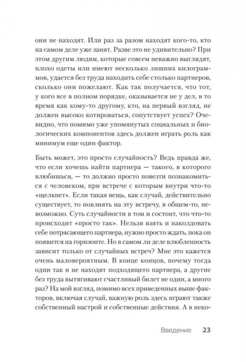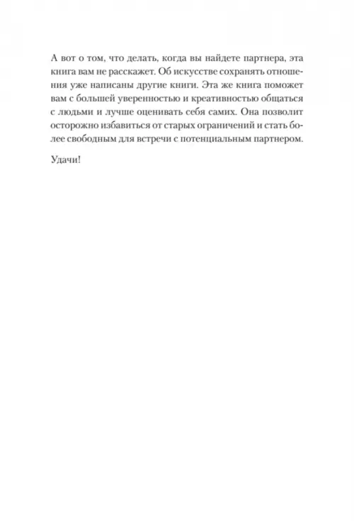 Как найти любовь? Есть множество людей, которые очень привлекательны, хорошо одеты, приятно пахнут, умны и скромны. У них есть все, что только можно пожелать. И все же партнера они не находят. Или раз за разом находят кого-то, кто уже занят. Разве это не удивительно? При этом другим людям, которые совсем неважно выглядят, плохо одеты или имеют несколько лишних килограммов, удается без труда находить себе столько партнеров, сколько они пожелают. Как так получается, что тот, у кого все в полном порядке, оказывается не у дел, в то время как кому-то другому, кто, на первый взгляд, не должен высоко котироваться, сопутствует успех? Эта книга содержит уникальные практики, упражнения, ритуалы и медитации, которые помогут вам обрести партнера. Главное - получать удовольствие от поиска!