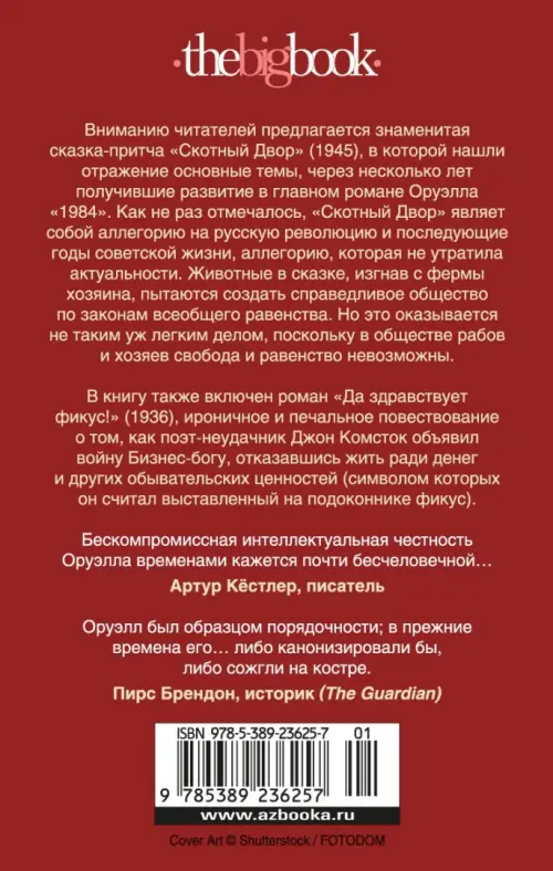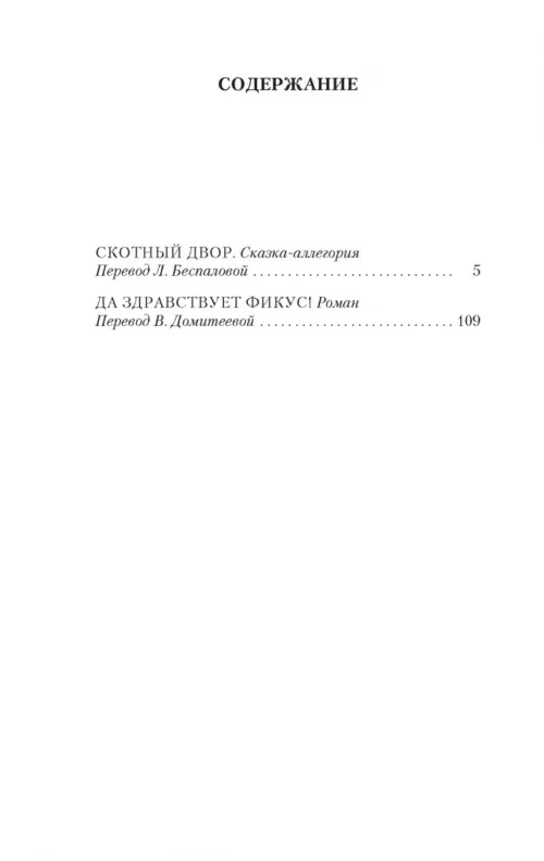 Английский писатель, критик и публицист Джордж Оруэлл (настоящее имя Эрик Артур Блэр) известен читателям, прежде всего, как автор культового романа «1984», последнего произведения Оруэлла, которое, наряду с «Мы» Замятина и «Прекрасным новым миром» Хаксли, стало одной из главных книг-антиутопий ХХ века. В настоящее издание вошла знаменитая сказка-притча «Скотный Двор» (1945), в которой нашли отражение основные темы, через несколько лет получившие развитие в главном романе Оруэлла. Как не раз отмечалось, «Скотный Двор» являет собой аллегорию на русскую революцию и последующие годы советской жизни, аллегорию, которая не утратила своей актуальности. Животные в сказке, изгнав с фермы хозяина, пытаются создать справедливое общество по законам всеобщего равенства. Но это оказывается не таким уж легким делом, поскольку в обществе рабов и хозяев свобода и равенство невозможны. В книгу также включен роман «Да здравствует фикус!» (1936), ироничное и печальное повествование о том, как поэт-неудачник Джон Комсток объявил войну Бизнес-богу, отказавшись жить ради денег, достойного социального статуса и других обывательских ценностей (символом которых он считал выставленный на подоконнике фикус).