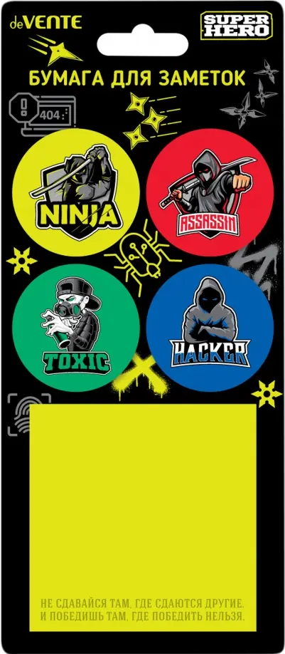 Набор клейкой бумаги для заметок "deVENTE. SuperHero" 100x230 мм, размер заметок: 45x45 мм и 80x80 мм, 5x20 листов, офсет 80 г/м?, печать 4+0, ассорти форм, 5 дизайнов, в картонном блистере и пластиковом пакете с европодвесом