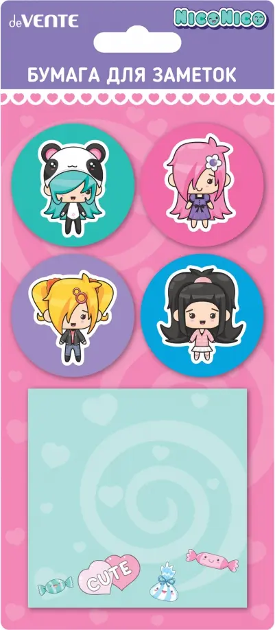Набор клейкой бумаги для заметок deVENTE. NicoNico:-) 100x230 мм, размер заметок: 45x45 мм и 80x80 мм, 5x20 листов, офсет 80 г/м?, печать 4+0, ассорти форм, 5 дизайнов, в картонном блистере и пластиковом пакете с европодвесом