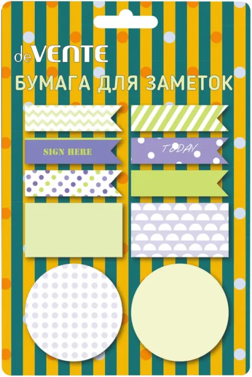 Набор клейкой бумаги для заметок "deVENTE. Pattern" 12x45 мм, 25x45 мм и 45x45 мм, 10x20 листов, офсет 80 г/м?, печать 4+0, ассорти форм, 10 дизайнов, в картонном блистере и пластиковом пакете с европодвесом