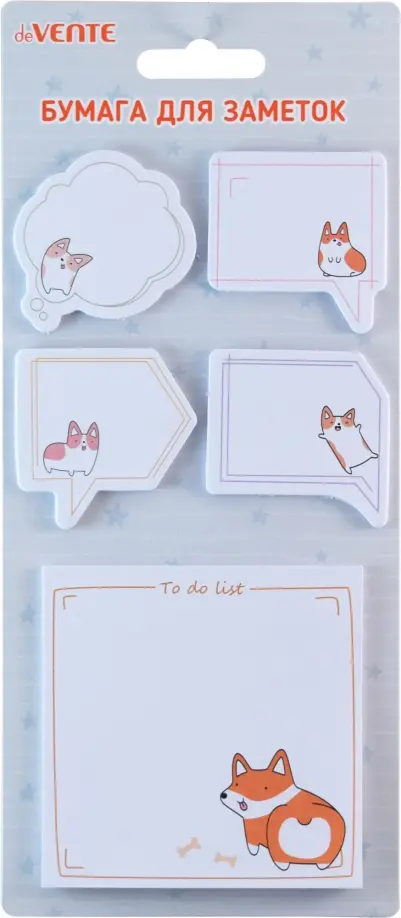 Набор клейкой бумаги для заметок "deVENTE. Funny Corgi" 45x45 мм и 80x80 мм, 5x20 листов, офсет 80 г/м?, печать 4+0, ассорти форм, 5 дизайнов, в картонном блистере и пластиковом пакете с европодвесом