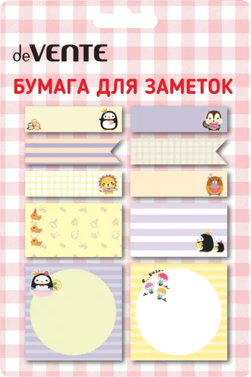 Набор клейкой бумаги для заметок "deVENTE. Penguin and Others" 12x45 мм, 25x45 мм и 45x45 мм, 10x20 листов, офсет 80 г/м?, печать 4+0, ассорти форм, 10 дизайнов, в картонном блистере и пластиковом пакете с европодвесом