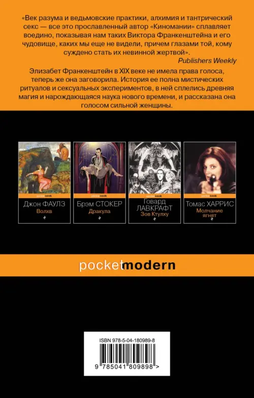 Все знают историю о докторе Франкенштейне и его чудовище; за минувшие почти два столетия она успела обрасти бесчисленными новыми смыслами и толкованиями, продолжениями и экранизациями. Но Элизабет Франкенштейн получает слово впервые. История ее полна мистических ритуалов и сексуальных экспериментов, в ней сплелись древняя магия и нарождающаяся наука нового времени, и рассказана она голосом сильной женщины, столкнувшейся с обстоятельствами непреодолимой силы.
