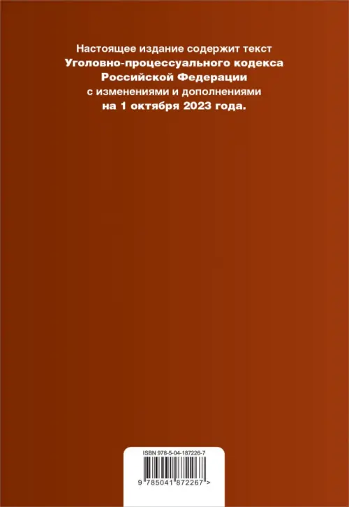 Настоящее издание содержит текст Уголовно-процессуального кодекса Российской Федерации с изменениями и дополнениями на 1 октября 2023 года с удобной навигацией, таблицей изменений и путеводителем по судебной практике. Если есть изменения, вступающие в силу позднее, то вместе с редакцией нормы, действующей на эту дату, приводится норма в новой редакции и указывается дата, с которой она вступает в силу.