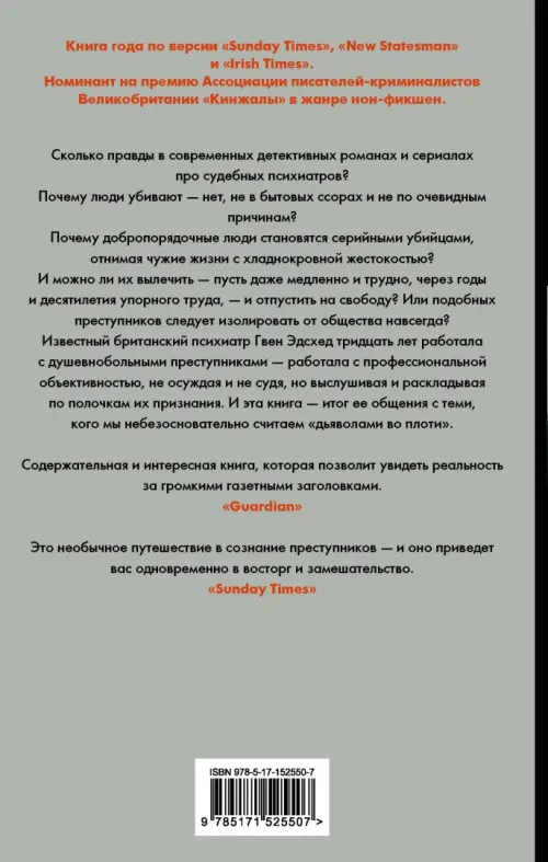 Известный британский психиатр Гвен Эдсхед тридцать лет работала с душевнобольными преступниками — работала с профессиональной объективностью, не осуждая и не судя, но выслушивая и раскладывая по полочкам их признания. И эта книга — итог ее общения с теми, кого мы небезосновательно считаем "дьяволами во плоти".