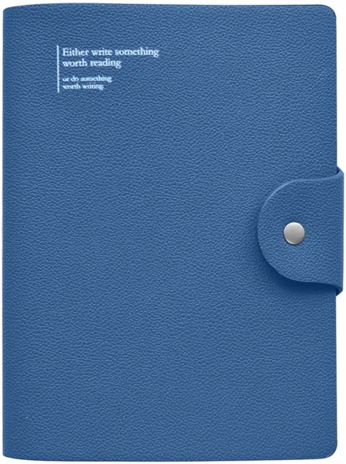 Обложка - мягкая, полускрытая спираль, фактурная искусcтвенная кожа, цвет - синий. Блок датированный, 320 стр, прямые уголки, бумага: цвет - слоновая кость, 70 г/м2, печать 2+2. Особенности: клапан на кнопке, печать белой шелкографией