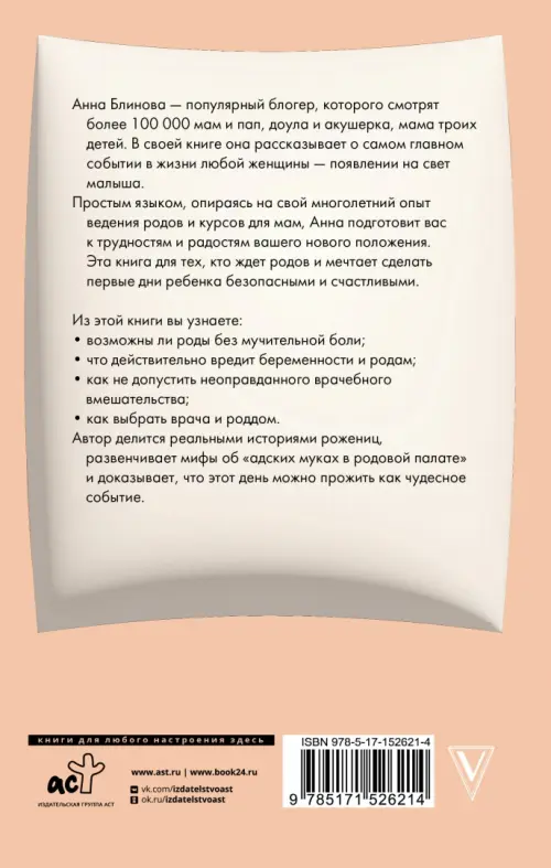 Анна Блинова — популярный блогер, которого смотрят более 100 000 мам и пап, доула и акушерка, мама троих детей. В своей книге она рассказывает о самом главном событии в жизни любой женщины — появлении на свет малыша.
