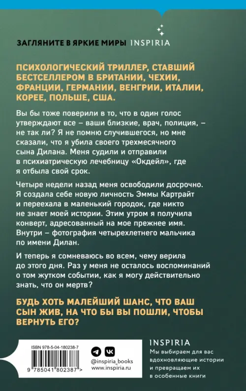 Четыре недели назад меня освободили досрочно. Я создала себе новую личность Эммы Картрайт и переехала в маленький городок, где никто не знает мою историю. Этим утром я получила конверт, адресованный на мое прежнее имя. Внутри - фотография четырехлетнего мальчика по имени Дилан.