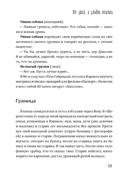 В ХХI веке Георгий Данелия написал несколько книг, ставших бестселлерами, и фактически создал жанр короткометражного рассказа, потому что писал их прежде всего, как кинорежиссер, совсем в духе модного сейчас автофикшена. Без назидания, но с потрясающей мудростью, накопленной за годы жизни и работы в кинематографе, и удивительным чувством юмора, автор рассказывает о своей семье, времени, в котором ему довелось жить и работать, друзьях, коллегах и многих всемирно известных людях, с которыми свела его судьба на съемочной площадке и в обыденной жизни. Не случайно друзья называли Георгия Данелия «умнейшим человеком своего времени». В общем, читайте, скучать не придется!