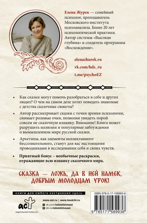 Как сказки могут помочь разобраться в себе и других людях? Здесь вы найдете разборы известных сказочных сюжетов от практикующего семейного психолога, преподавателя Московского института психоанализа – Елены Журек. Обращаясь к архетипам в сказках, как элементам коллективного бессознательного, вы сможете исследовать себя и свои чувства. Знакомые с детства герои сказок предстанут в совершенно неожиданном свете. Приятный бонус – необычные раскраски, отражающие всю изнанку сказочного мира.