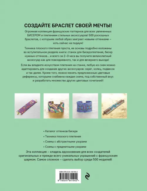 Уникальный каталог французских схем для широких браслетов из бисера дает уникальные возможности. Можно с нуля освоить технику бисероплетения на станке. Можно создать 500 потрясающих браслетов из книги с абстрактными или предметными узорами на все случаи жизни. Можно менять цветовую палитру и разрабатывать собственные дизайны на основе представленных. Можно адаптировать схемы для создания любых других украшений — серег, колье, колец, — или даже картин!