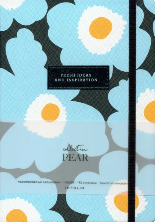 Обложка - твердая с резинкой, фактурная искусственная кожа с печатью по кожзаму, цвет - голубые цветы. Блок - недатированный, 192 стр., скругленные уголки, кармашек, 2 ляссе, бумага: слоновая кость, скругленные уголки, 70 г/м2, печать 2+2. Особенности: нашивка с печатью, белая шелкография.