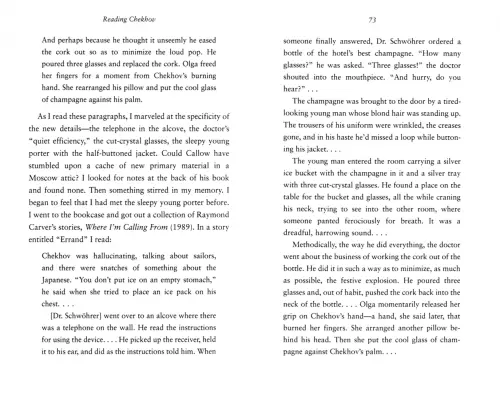 Книга состоит из трёх частей: биография Чехова, критический анализ его творчества и хроника поездки Джанет Малкольм по ельцинской России. Последняя выходит особенно ярко за счёт привычки автора сравнивать всех, кто встречается у неё на пути, с чеховскими героями. Кого-то это может оттолкнуть, у меня, вон, вызвало хихиканье. Первые две части удались...