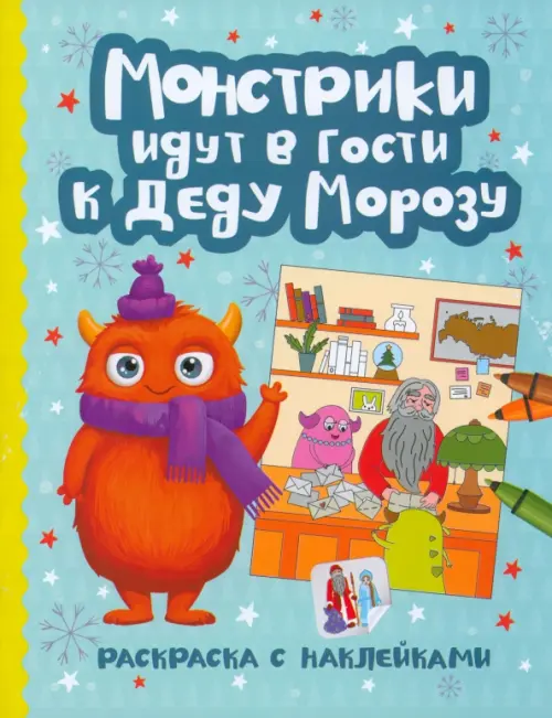 Монстрики идут в гости к Деду Морозу. Раскраска с наклейками