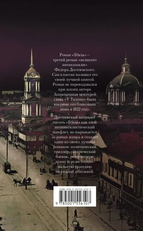 "Бесы" — третий роман "великого пятикнижия" Федора Достоевского. Сам классик называл его своей лучшей книгой. Роман не переиздавался при жизни автора. Запрещенная цензурой глава "У Тихона" была впервые опубликована лишь в 1922 году.