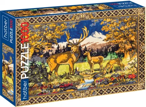 В советские времена ковер на стене считался неотъемлемым признаком достатка. Ковры персидского и турецкого производства представляли собой великолепные произведения прикладного искусства и стоили достаточно дорого. Бюджетнее обходились гобелены с оленями, охотниками, замками и прочими видовыми композициями в сдержанных тонах. На этом пазле - один из таких гобеленов: семейство благородных оленей мирно пасется на фоне белоснежных гор и умиротворяющей природы.