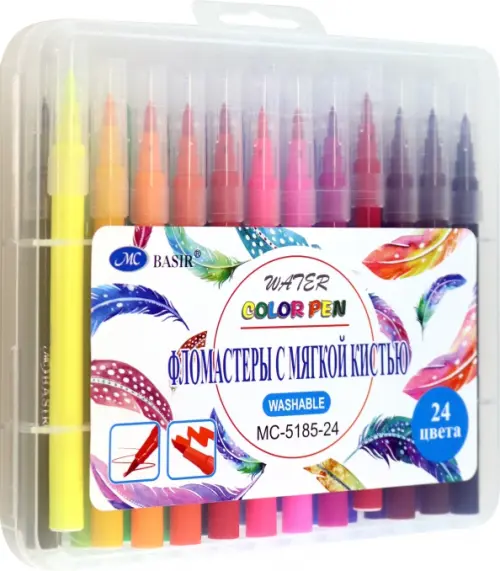 Набор фломастеров: с мягкой кистью; цветной корпус, вентилируемый колпачок, упаковка-пластмассовый бокс с европодвесом, 24 цвета.