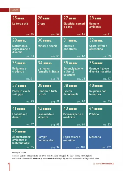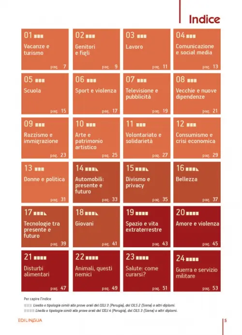 Пособие предоставляет широкий спектр учебных материалов: множество повседневных тем, позволяющих обсуждать различные аспекты современной жизни и представленных в виде красочных фотографий и инфографики, различных текстов и вопросов; коммуникативные задания, направленные на решение проблем, аналогичные задачам различных устных экзаменов, например, CELI 3; выражения и максимы, позволяющие практиковать анализ и комментарии некоторых известных фраз, таких как, например, в CELI 5; глоссарий, облегчающий подготовку к обсуждению.