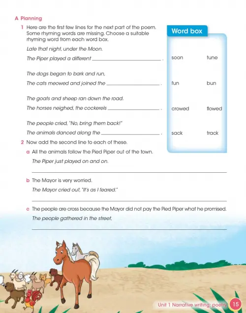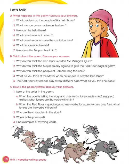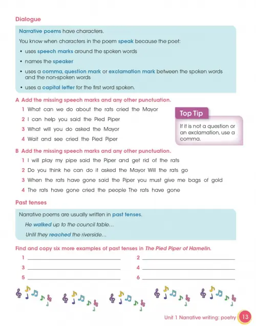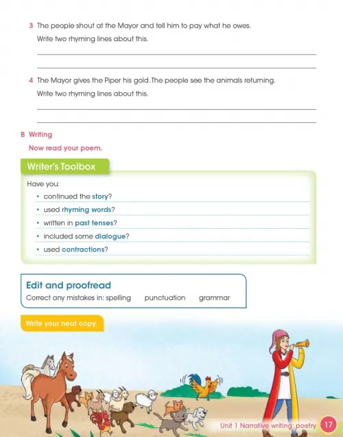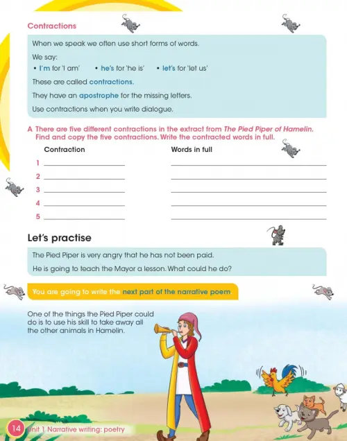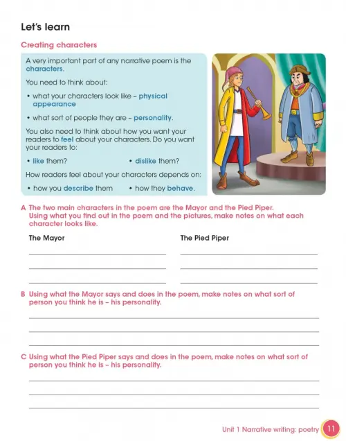 Introduce your learners to creative writing and writing for a purpose. They’ll write a biography of a famous person and a poem based on The Pied Piper, helping build their extended writing skills as they progress through the units. Each unit focuses on a different text type such as dialogue, recounts, reports or instructions. Model texts in each chapter show learners good examples of each writing type and specific activities are included to help them practise their grammar. Planning tools and an extended writing task develop learners’ essential skills including editing, checking, planning and creative thinking.