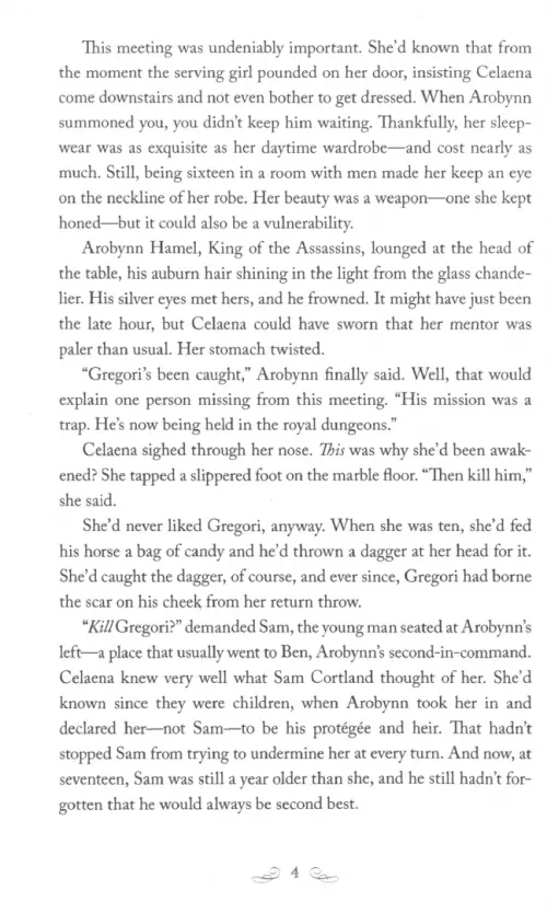 Celaena Sardothien is her kingdom's most feared assassin. Though she works for the powerful Assassin's Guild and its scheming master, Arobynn Hamel, she yields to no one and trusts only her fellow killer-for-hire, Sam. But when Arobynn dispatches her on missions that take her from remote islands to hostile deserts, Celaena finds herself acting independently of his wishes and questioning her own allegiance.