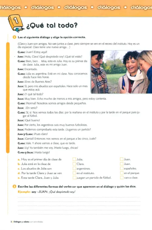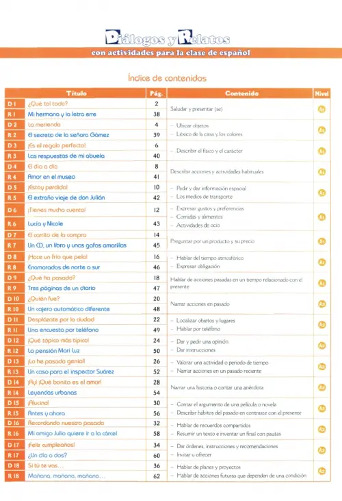 Consta de 18 diálogos y 18 relatos donde se practican de manera lúdica y participativa los contenidos fundamentales de los niveles A1 y A2.