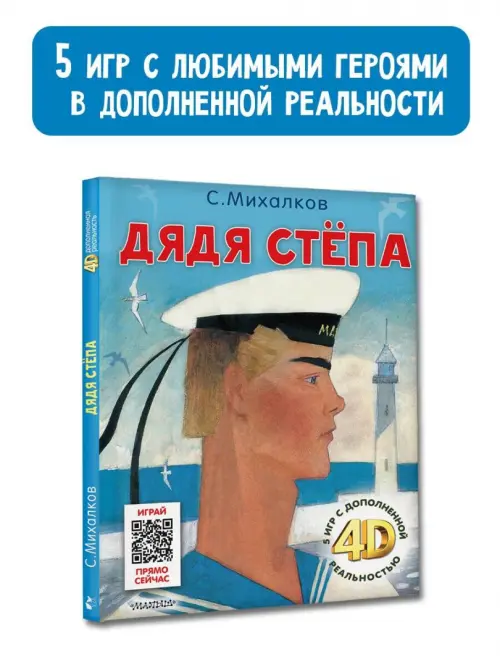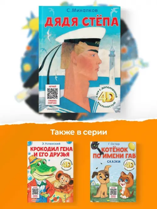 В книгу С. Михалкова «Дядя Стёпа» вошли три части поэмы о самом главном великане: «Дядя Стёпа», «Дядя Стёпа — милиционер» и «Дядя Стёпа и Егор». В каждой части этой поэмы дядя Стёпа совершает подвиги, которые под силу каждому: помощь ближнему, спортивные достижения, забота о близких. И такой друг может появиться у тебя дома, ведь это необычная книжка, а с дополненной реальностью 4D! Теперь с дядей Стёпой можно играть, путешествовать, помогать совершать подвиги и потренировать его сына-космонавта перед отправкой в космос!
