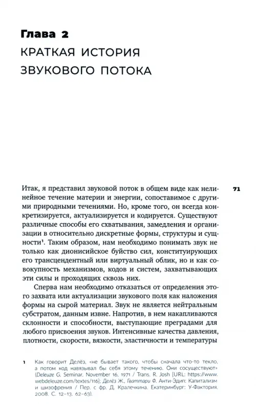 Последние десятилетия мы наблюдаем в современной культуре смещение «от музыки к звуку», поскольку термин «музыка» уже не соответствует стремительному развитию новых художественных жанров и культурных установок. В результате такого смещения, с одной стороны, произошло бурное развитие саунд-арта, а с другой — расцвет Sound Studies в гуманитарных науках. Задача книги Кристофа Кокса — объяснить «звуковой поворот» в искусстве и культуре, а также показать, как звук вторгается на территорию философии и обновляет ее. Решая эту задачу, автор оспаривает магистральные концепции современной культурной теории, основанные на анализе дискурса и языка, и заявляет о необходимости новой материалистической эстетики не только звука, но и искусства вообще. Центральным для книги становится концепт звукового потока — анонимной материалистической силы, которая предшествует человеку и превосходит его субъективный опыт. В попытке выстроить реалистическую и натуралистическую модель описания звука, Кокс обращается к идеям Артура Шопенгауэра, Фридриха Ницше, Жиля Делеза и Мануэля Деланды, иллюстрируя их работами Ла Монте Янга, Элвина Люсье, Кристиана Марклея, Марианн Амахер, Анни Локвуд и многих других. В итоге перед нами не только одно из наиболее фундаментальных и глубоких исследований онтологии звука, но и увлекательная история малоизученного звукового искусства последних пятидесяти лет.