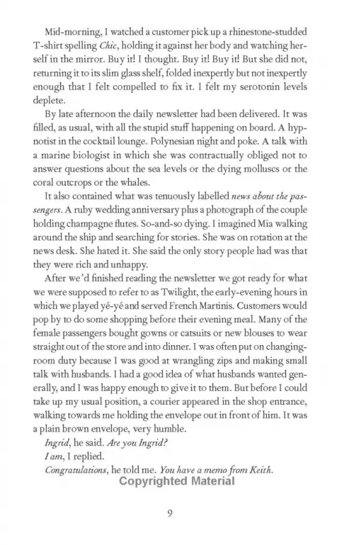 Meet Ingrid. She works on a gargantuan luxury cruise liner, where she spends her days reorganizing the merchandise and waiting for long-term guests to drop dead in the changing rooms. On her days off, she disembarks from the ship and gets blind drunk on whatever the local alcohol is. It's not a bad life. And it distracts her from thinking about the other life she left behind five years ago.