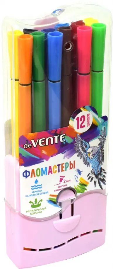 Фломастеры "deVENTE" 12 цветов, шестигранный корпус 8x165 мм, с вентилируемым колпачком, в плоской пластиковой подставке с подвесом, розовая подставка