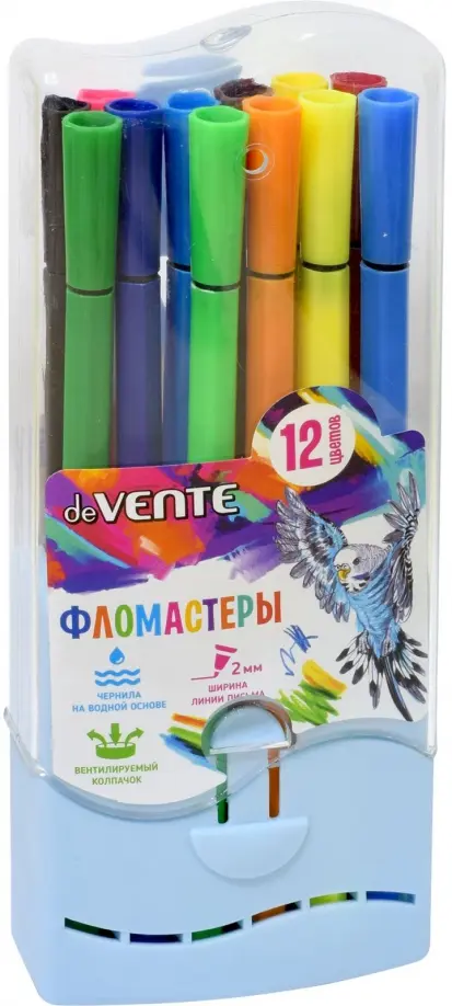 Фломастеры "deVENTE" 12 цветов, шестигранный корпус 8x165 мм, с вентилируемым колпачком, в плоской пластиковой подставке с подвесом, голубая подставка