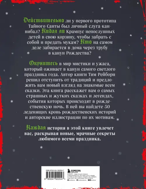 Окунитесь в мир мистики и ужаса, который оживает в канун самого светлого праздника года. Автор книги Тим Рейборн решил отступить от традиций и предложить вам новый взгляд на знакомые всем сказки. Эта книга расскажет вам о самых страшных и жутких сказках и легендах, которые происходят в рождественскую ночь. В ней вы найдете 50 леденящих кровь рождественских историй и авторские иллюстрации по их мотивам.