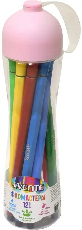 Фломастеры "deVENTE" 12 цветов, шестигранный корпус 8x165 мм, с вентилируемым колпачком, в круглой пластиковой подставке, розовая подставка
