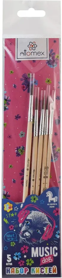 Набор кистей "Attomex. Music Dog" 05 шт (пони № 1, 2, 3, 4, 5) деревянная ручка, в пластиковом блистере