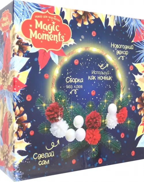 В этом наборе вы найдете все необходимое, чтобы создать красивый новогодний декор для дома. Прикрепите к деревянному кругу еловые ветки, елочные игрушки, мягкие помпоны и гирлянду – и украшение готово! Кстати, помпоны вы тоже сделаете сами с помощью специальной заготовки. В наборе есть подробная инструкция.