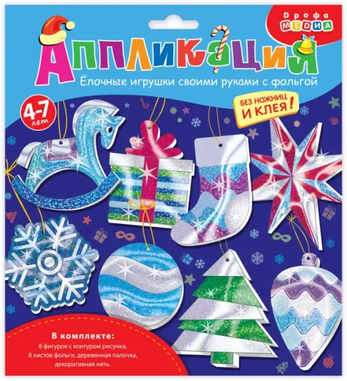 В комплекте: 8 фигурок из ЭВА, 8 листов фольги, деревянная палочка, декоративная нить.