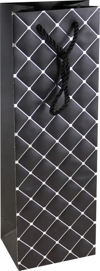 Подарочный чёрный бумажный пакет от торговой марки Perfect Craft отличается особой элегантностью, так как выполнен из дизайнерской однотонной бумаги с тиснением в виде разных геометрических узоров. Данный вариант имеет размер 12*36*9 см.