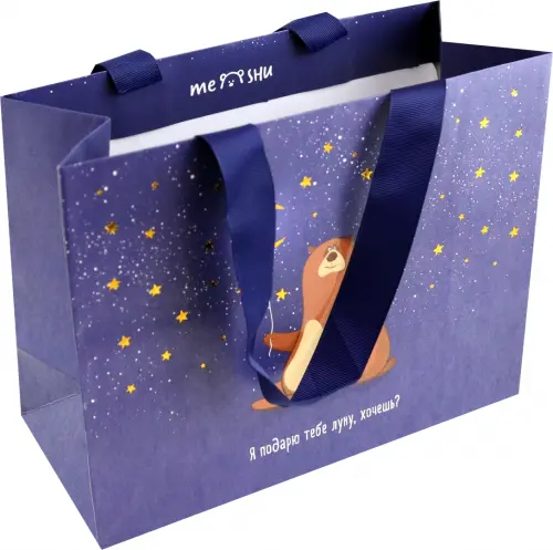 Стильный подарочный пакет MESHU выделит ваш презент из массы других. Размер пакета – 18*23*10 см. Пакет изготовлен из ламинированного картона. Ручки пакета – прочный шнурок.