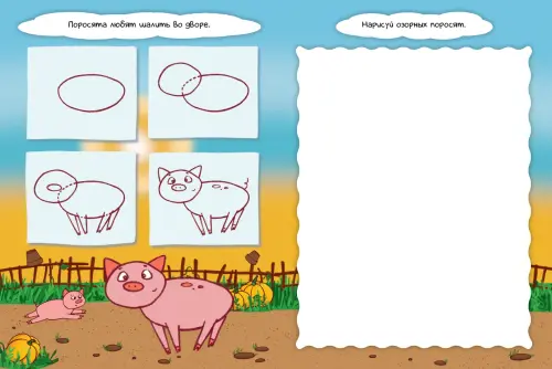 Посмотри, как много интересного в деревне: пушистые овечки, непоседливые поросята и большой железный трактор. Вот бы всё это нарисовать!