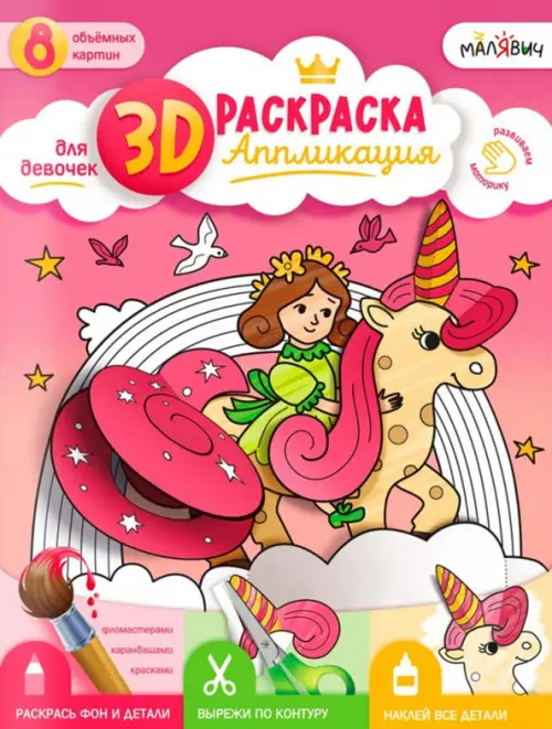 «3D-раскраска-аппликация. Для девочек» под брендом «МалЯвич» – это творческая тетрадь для создания объёмных картин! Внутри 8 картинок принцесс и детали к ним. Раскрасьте, вырежьте, приклейте – и полюбуйтесь результатом! Готовые картины можно подарить друзьям, украсить ими комнату или устроить выставку.
