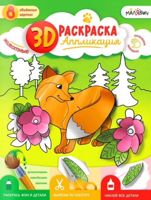 «3D-раскраска-аппликация. Животные» под брендом «МалЯвич» – это творческая тетрадь для создания объёмных картин! Внутри 8 картинок животных и детали к ним. Раскрасьте, вырежьте, приклейте – и полюбуйтесь результатом! Готовые картины можно подарить друзьям, украсить ими комнату или устроить выставку.
