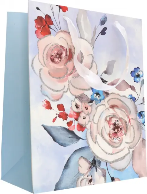 Выполнен из плотной бумаги 210 г/кв.м, для удобной переноски на пакете имеются две ручки из атласной ленты.