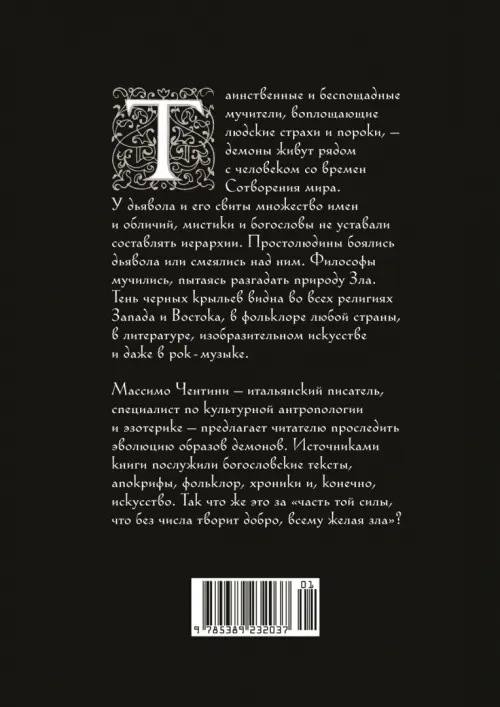 Демонология — богатая ветвь мифологии и теологии. Демонов можно найти во всех видах искусств, они побывали во всех землях от Запада до Востока, на небе и под землей. Массимо Чентини — итальянский писатель, специалист по культурной антропологии и эзотерике — предлагает проследить эволюцию образа дьявола и его свиты в мифологическом, историческом и культурно-историческом пространстве.