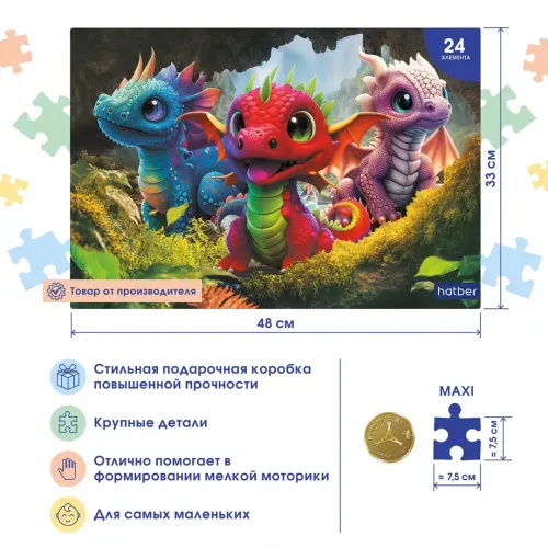 Пазл MAXI состоит из крупных элементов, изготовленных из экологически безопасного и не расслаивающегося картона. Предназначен для самых маленьких, отлично помогает в формировании мелкой моторики малыша. Сюжет и персонажи картинки яркие и интересные, хорошо прорисованные.