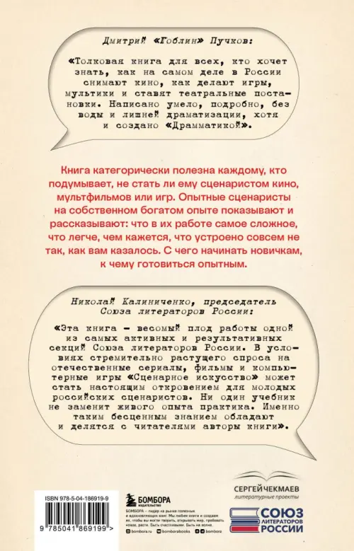«Мы поделились самым важным из того, что знаем о кино-, анимационной, театральной, игровой и комиксовой сценаристике. Даже если о чем-то нам больно говорить, и мы до сих пор всхлипываем по ночам». — Авторы книги, члены Союза литераторов РФ